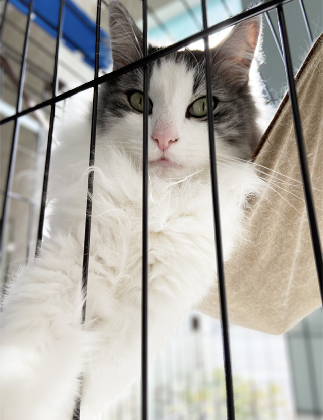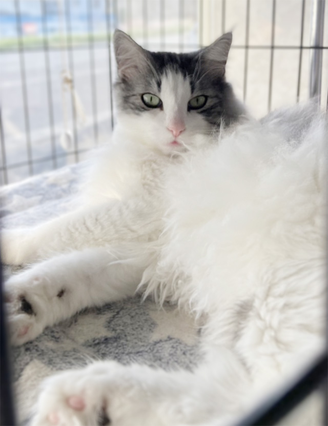 ふわふわの毛並みと穏やかな性格が魅力で、訪れるお客様の心をほっと和ませてくれる存在です。